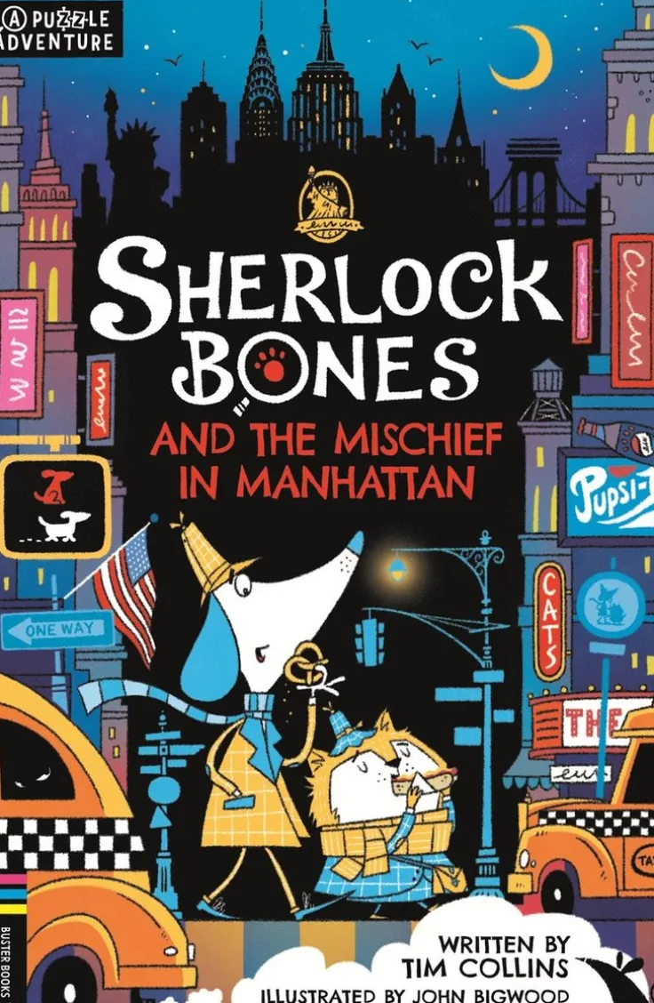 Sherlock Bones, the world’s greatest dog detective, and his trusty sidekick Dr Jane Catson are back for another crime-solving adventure. Bones and Catson are visiting New York when the local police chief asks for their help. The city is being terrorised by a masked villain who is threatening the police with chaos if they don’t solve his riddles. After thwarting a fiendish plot in Manhattan, Bones and Catson are hot on the heels of the mysterious criminal on an epic coast-to-coast chase across USA. Along the way, they take in Niagrowl Falls and scale the faces of the great dog presidents on Mount Ruffmore until the adventure concludes at the walls of Aldogtraz prison in San Francisco. But there’s a greater mystery to solve while all this is going on. Who is the villain? And how can they unmask them? The fifth book in Buster’s Sherlock Bones fiction series features intricate artwork and illustrated puzzles – including search-and-finds, mazes and number riddles – that are woven into the action, so the reader feels immersed in the exciting detective plot. Also available in the series: 9781780557502 Sherlock Bones and the Case of the Crown Jewels 9781780557519 Sherlock Bones and the Curse of the Pharaoh’s Mask 9781780559216 Sherlock Bones and the Mystery of the Vanishing Magician 9781780559223 Sherlock Bones and the Horror of the Haunted Castle