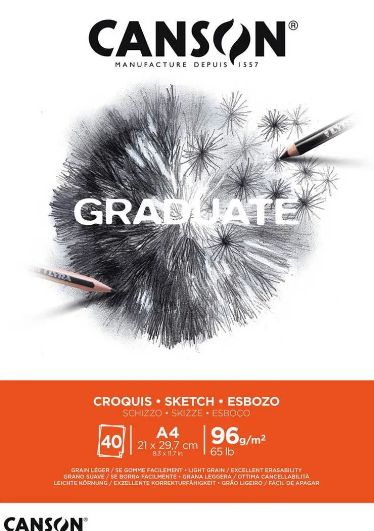 Canson® Graduate Sketch-block i A4 format innehåller lite tjockare vitt papper. Blocket består av 40 ark med lätt strukturerat papper som är perfekt för att sudda ut detaljer och för snabba blyertsskisser. Syrafritt och FSC-certifierat papper tillverkat i Frankrike.