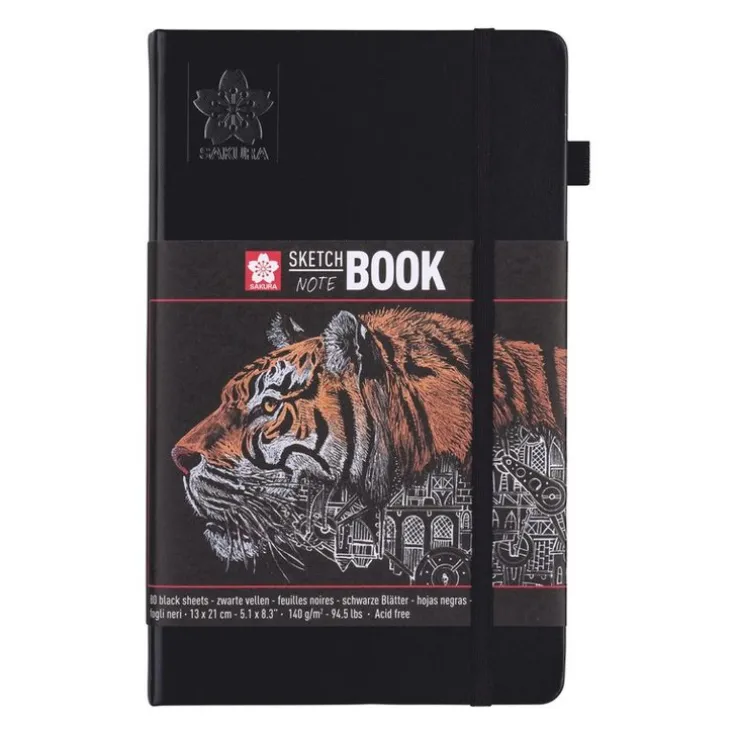 Sakura Sketch – Inbundet anteckningblock 13X21 cm med 80 svarta ark i 140 g/m2 syrafritt papper. Lämpliga för alla åldrar. Perfekt till Sakura produkter tuschpennor, oljepastel och kritor. Inklusive en pennahållare och en utvidgbar ficka längst bak i boken.Art by: Dan Hogman