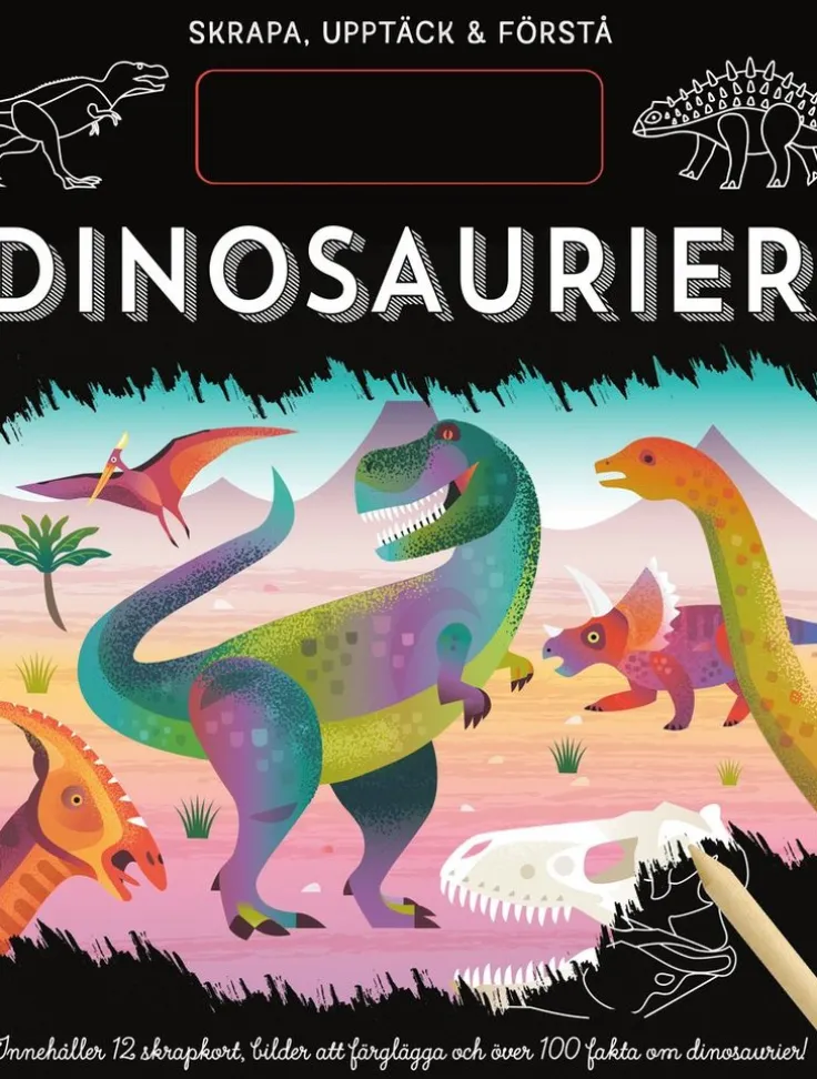 Skrapa, upptäck och förstå dinosaurier. Boken innehåller tolv skrapkort, bilder att färglägga och över hundra fakta om dinosaurier.