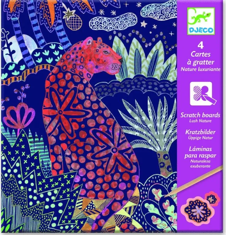 Barnpyssel från Djeco med fyra olika skrapkort med motiv av vilda djur. Med det medföljande träverktyget skrapas färger och mönster fram, det som från början var ett enfärgat kort blir till en färgsprakande bild. Ett enkelt och rogivande pyssel för att varva ner eller som tidsfördriv på resan.