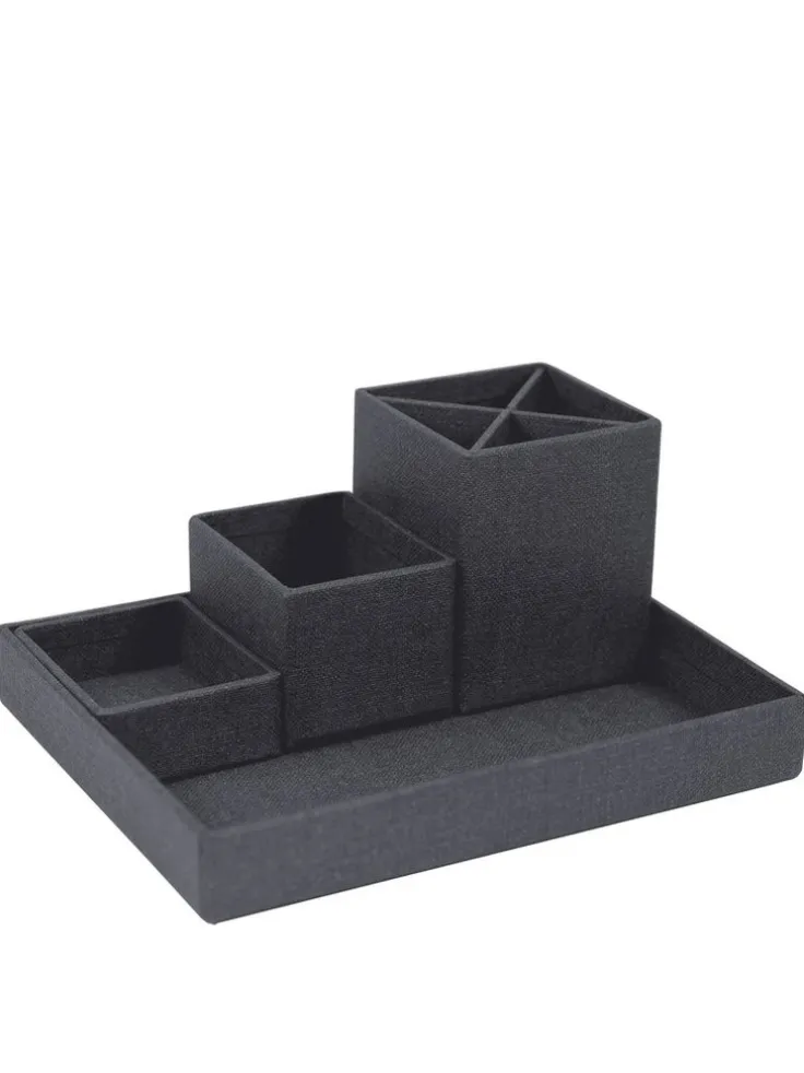 Lena skrivbordsställ från svenska familjföretaget Bigso – Skrivbordsförvaring i 4 delar som hjälper dig att organisera pennor, gem, laddare och andra skrivbordstillbehör. De tre kopparna är lösa och kan lätt plockas ur vid behov. Med gummifötter som skyddar underlägget och ökar stabiliteten. Stark konstruktion som tål att användas varje dag. Ingår i en snygg och stilren skrivbordserie från Bigso som passar lika bra på kontoret som hemma, där du vill ha ordning och reda. Kan staplas med brevkorgen Håkan, clips medföljer.Tillverkad av 100% återvunnen fiberpapp med ett ytskikt av präglat papper vars textur liknar grovt linneväv.Detta ger produkten ett rustikt, men samtidigt stilrent och modernt utseende.Mått: 23,5x18x11 cm