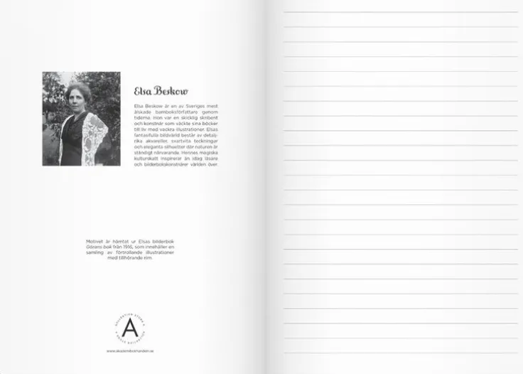 Ett beigt skrivhäfte i mjukpärm med 96 linjerade sidor som passar för alla dina texter, tankar och idéer. Motivet är hämtat ur Elsa Beskows bilderbok Görans bok från 1916 som innehåller en samling av förtrollande illustrationer och tillhörande rim. A5-format80 g linjerat papperFSC®-märkt papper, ett bättre val för dig och vår världElsa Beskow är en av Sveriges mest älskade barnboksförfattare genom tiderna. Hon var en skicklig skribent och konstnär som väckte sina böcker till liv med vackra illustrationer. Elsas fantasifulla bildvärld består av detaljrika akvareller, svartvita teckningar och eleganta silhuetter där naturen är ständigt närvarande. Hennes magiska kulturskatt inspirerar än idag läsare och bilderbokskonstnärer världen över. Nu i ett unikt samarbete med Akademibokhandeln för vår egen kollektion – Kollektion Stora A.