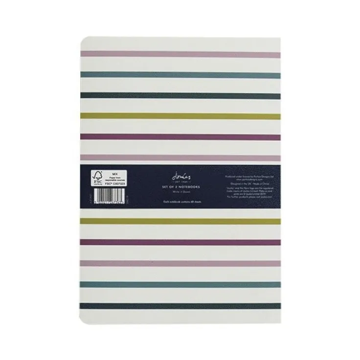 Två anteckningsböcker i A5-format med 96 linjerade sidor i vardera. Den ena boken har ett härligt blommönster och den andra är randig. Böckerna har matchande innerpärmar och rundade hörn. Fin struktur i omslagen som kompletterar de fina mönstren.