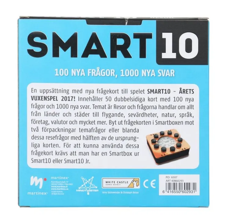 En uppsättning nya frågekort till spelet Smart10 – Årets Vuxenspel 2017! Innehåller 50 dubbelsidiga kort med 100 nya frågor och 1000 nya svar. Temat är Resor och frågorna handlar om allt från länder och städer till flygande, sevärdheter, natur, språk, företag, valutor och mycket mer. Byt ut frågekorten i Smartboxen mot två förpackningar temafrågor eller blanda dessa resefrågor med hälften av de ursprungliga korten. För att kunna använda dessa frågekort krävs att man har en Smartbox ur Smart10 eller Smart10 Jr. Regler på svenska. 2-8 spelare, 20 min+, 14+