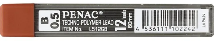 Blyertsstift till stiftpennor. 12 st per tub från Japanska tillverkaren Penac. Bra mix av svärta, brytsäkerhet och flexibilitet tack vare samansättningen av grafit och polymer. Stiften finns i olika hårdheter som befinner sig på en skala med siffror i kombination med H eller B. H betyder ”hard” och B betyder ”black” – en bra minnesregel när det gäller att komma ihåg vad som egentligen är vad. Ju högre siffra i kombination med H betyder ett hårdare stift, som inte heller blir lika mörkt på pappret. Ju högre siffra i kombination med B betyder motsatsen, ett mjukare stift som blir desto mörkare i färgen och dessutom passar ypperligt att skugga med. Vad man tycker är skönast att skriva med är dock högst individuellt, men den hårdhet de flesta använder vid vanligt skrivande är HB. Kanske just för att den är alldeles lagom för de flesta då den befinner sig mitt på skalan.