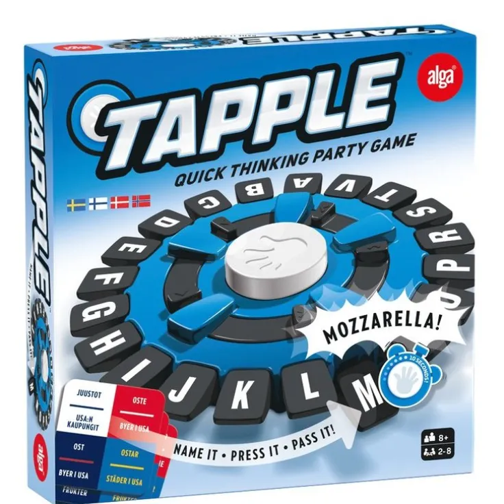 Populära Tapple erövrar världen! Med superkorta regler är Tapple spelet för alla tillfällen då vänner och familj är samlade. Spelmodulen är själva spelet och timer. Ta upp ett kort läs högt vilket ord ni ska tävla med, tex ostar. I tur och ordning ska ni trycka ner begynnelsebokstaven på olika ostar, tiden tickar och du har bara 10 sekunder på dig. Det går inte att upprepa samma bokstav.