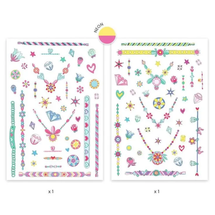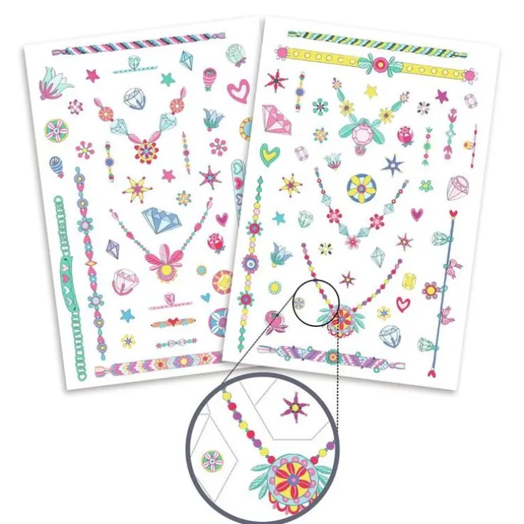 Över 60 tillfälliga tatueringar med temat juveler – halsband, armband, ringar i härliga färger. Tatueringarna dermatologiskt testade och enkla att applicera med lite vatten. Perfekta för lek, kalas eller när fantasin får ta plats.
