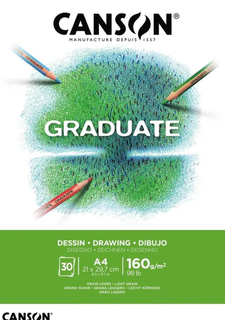 Canson® Graduate Rit Block i A4 format har slitstarkt och lätt texturerat vitt ritpapper. Hållbar yta som tål att suddas upprepade gånger. Det innehåller 30 ark, perfekt för att rita med penna, pastell, markörer eller kol. Syrafritt och FSC-certifierat papper tillverkat i Frankrike.