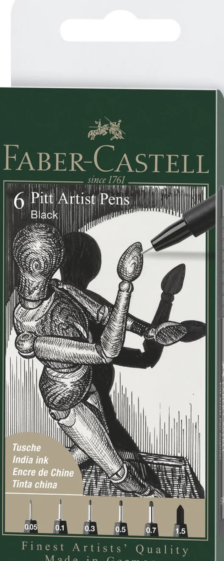 Pitt Artist Pen India ink pen, ask med 6 pennor i olika spetsbredd, colour 199 svart, XXS, XS, S, F, M, 1.5. Fantastiska pennor med högpigmenterat India ink. Ljusäkta. Lång och metallomsluten spets. Vattentåligt och permanent bläck. Lukftfritt, syrafritt och pH-neutralt. Blöder inte igenom papper. Pitt Artist serien är en global storfavorit bland både proffesionella och amatörkonstnärer tack vare dess höga kvalitet och följsamma och tåliga spetsar. Pitt Artist pennorna är perfekta för bl.a. sketcher, teckningar, layout, mode-design och illustrationer.