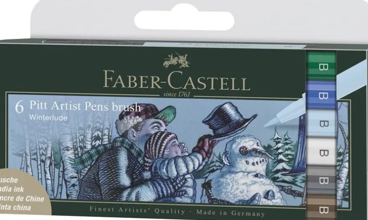 Pitt Artist Pen Brush India ink pen, ask med 6 penselpennor i vinterfärger för att måla vackra vinterlandskap (Winterlude). Fantastiska penselpennor med högpigmenterat India ink. Ljusäkta. Lång och metallomsluten spets. Vattentåligt och permanent bläck. Lukftfritt, syrafritt och pH-neutralt. Blöder inte igenom papper. Pitt Artist serien är en global storfavorit bland både proffesionella och amatörkonstnärer tack vare dess höga kvalitet och följsamma och tåliga spetsar. Pitt Artist pennorna är perfekta för bl.a. sketcher, teckningar, layout, mode-design och illustrationer.
