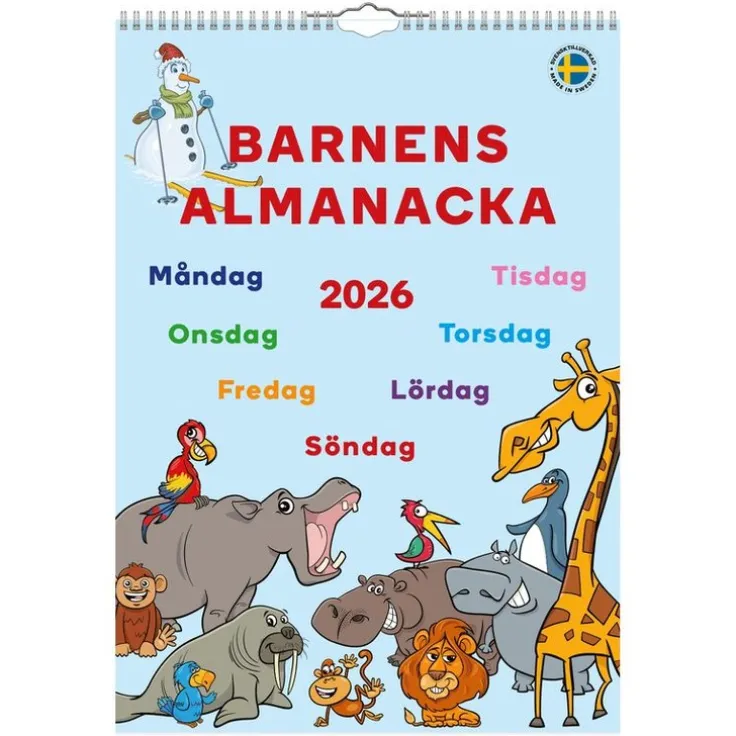 Barnens Almanacka 2026 är en aktivitetskalender som lär barnen tid, veckor, månader och år på ett roligt sätt. Kalendern är producerad och tryckt i Sverige på svenskt papper. Märkt med både Svanen och FSC.