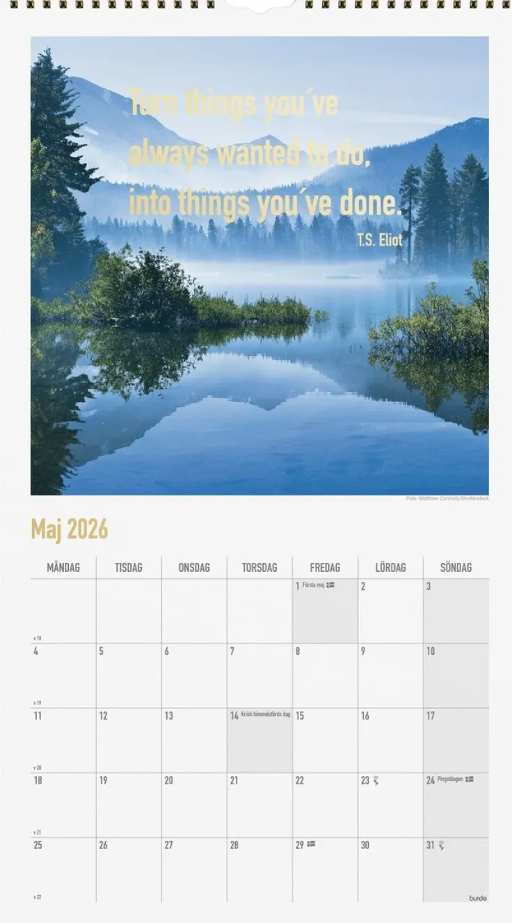 En vacker vägghängd kalender där varje månadsbild är som en tavla i sig. Planera in månadens göromål och njut av naturbilderna med tänkvärda citat, präglade i guldfolie. Kalendern ger dig en bra överblick och underlättar planeringen för både vardag och helg.>Väggkalender 2026 från Burde. Format: 250×450 mm. Layout: Månad/blad. Kalendarium: 2026-01-01 – 2026-12-31. Spiralbunden. Innehåll: Flaggdagar, helgdagar/aftnar,. Antal sidor: 12. Miljöinformation: FSC®.