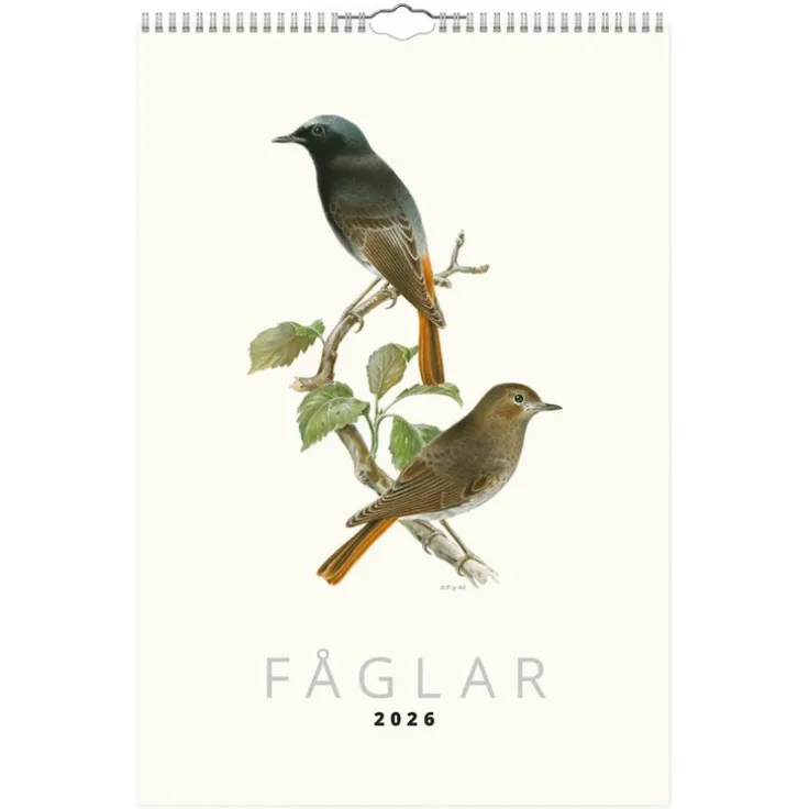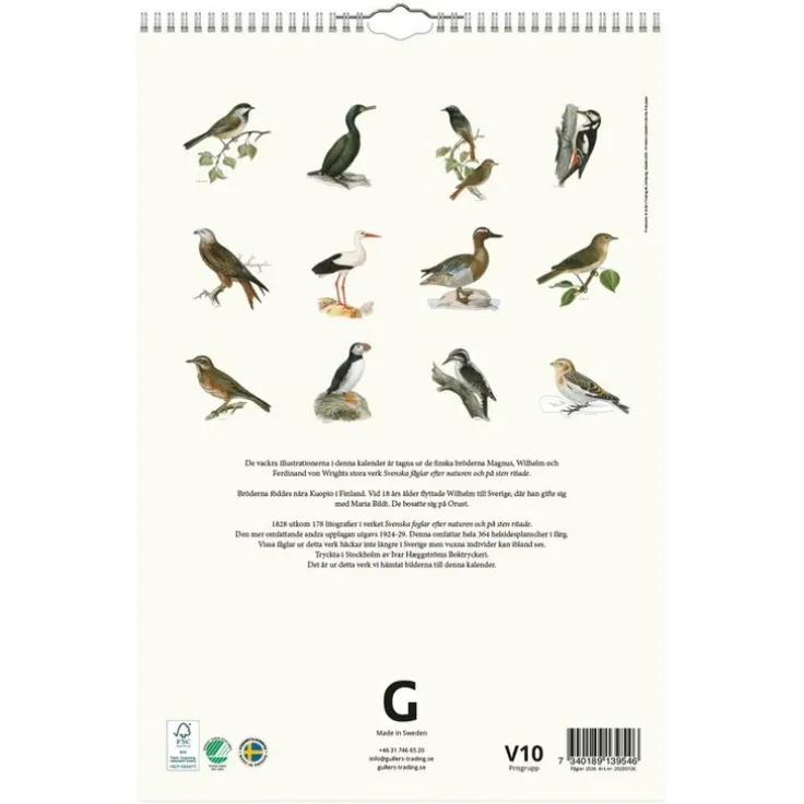 Väggkalender Fåglar 2026 med illustrationer av Magnus, Wilhelm och Ferdinand von Wright från 1800-talets mitt och slut. Svenska namndagar och helgdagar. Kalendern är producerad och tryckt i Sverige på svenskt papper. Märkt med både Svanen och FSC.