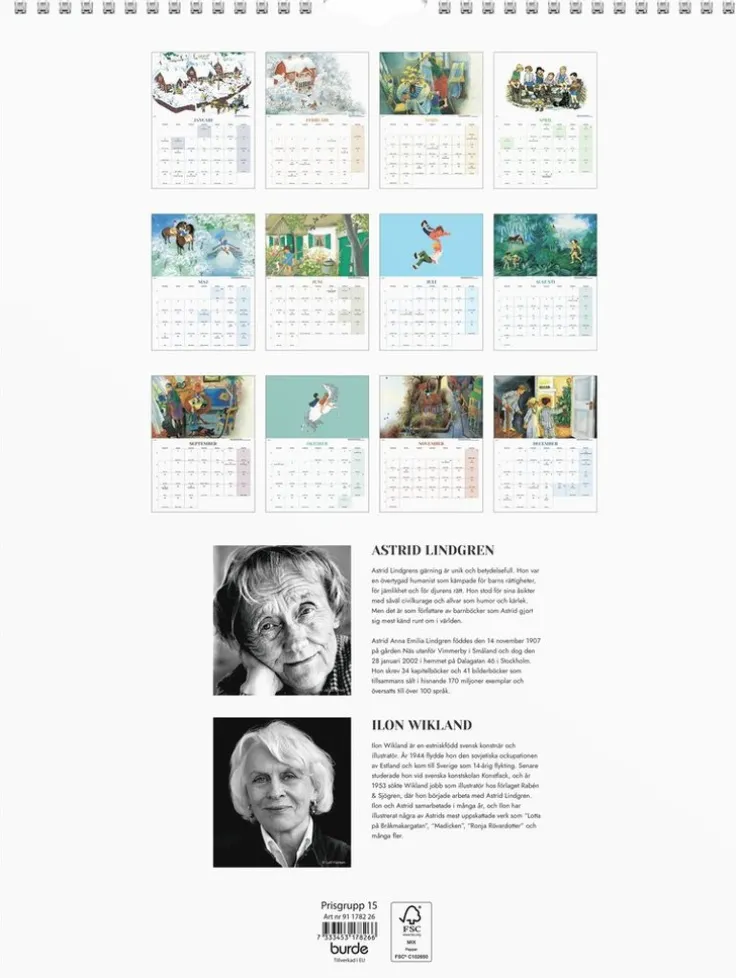 Dekorera ditt hem med minnen från din barndom, återupptäck Astrid Lindgrens karaktärer som är illustrerade av Ilon Wikland i form av en väggkalender. Prata om sagorna, återse filmerna och väck minnen och känslora du kände som barn till liv igen.>Väggkalender 2026 från Burde. Format: 295×390 mm. Layout: Månad/blad. Kalendarium: 2026-01-01 – 2026-12-31. Spiralbunden. Innehåll: Flaggdagar, helgdagar/aftnar, månfaser, namnsdagar, temadagar/händelser,. Antal sidor: 12. Miljöinformation: FSC®.