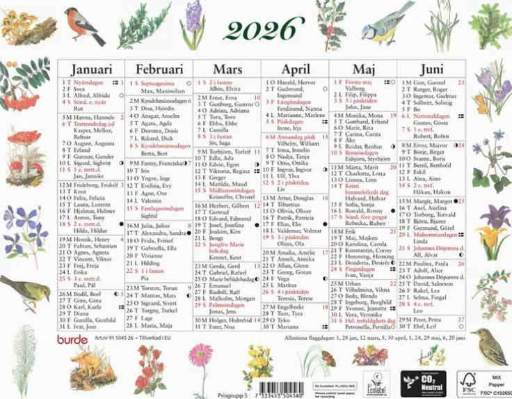 Väggkalender 2026 från Burde. Format: 245×190 mm. Layout: Halvår/sida. Kalendarium: 2026-01-01 – 2026-12-31. Innehåll: Kyrkliga helgdagar, flaggdagar, helgdagar, månfaser, namnsdagar,. Antal sidor: 2. Miljöinformation: FSC®. Klimatkompenserad. Ecolabel.