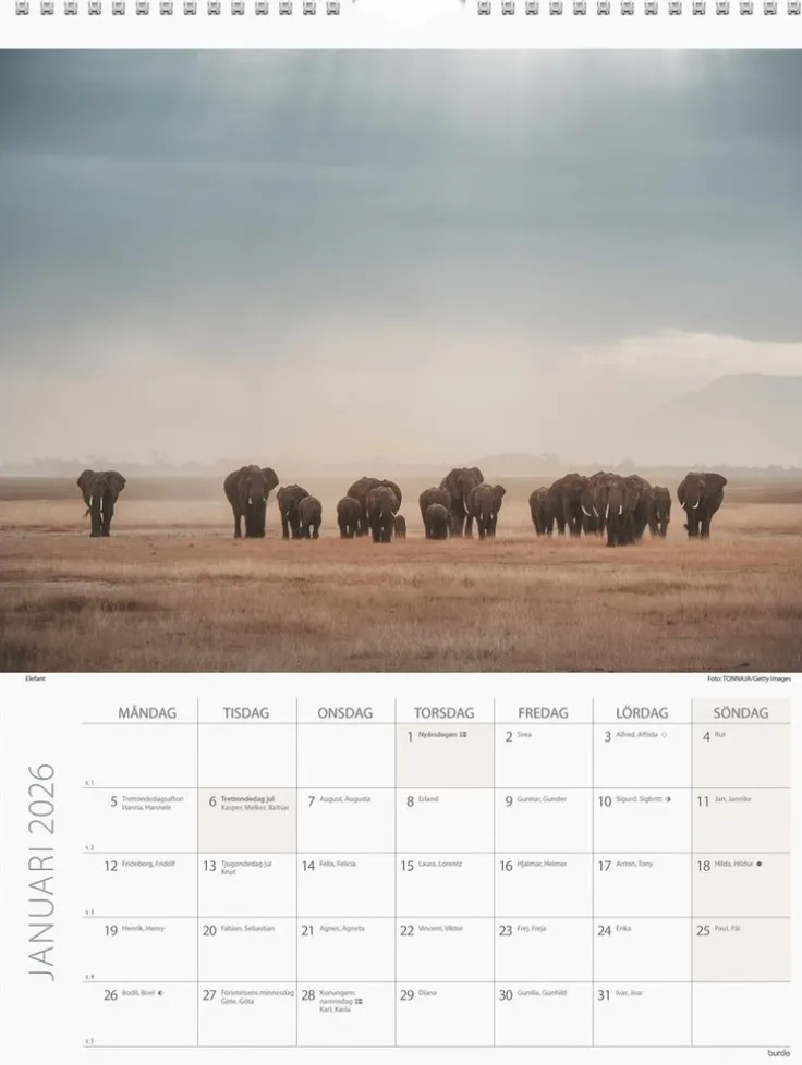 Väggkalender 2026 från Burde. Format: 295×390 mm. Layout: Månad/blad. Kalendarium: 2026-01-01 – 2026-12-31. Spiralbunden. Innehåll: Flaggdagar, helgdagar/aftnar, månfaser, namnsdagar, temadagar/händelser,. Antal sidor: 12. Miljöinformation: FSC®.