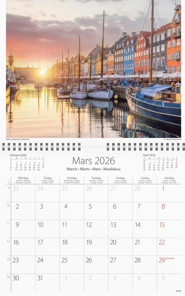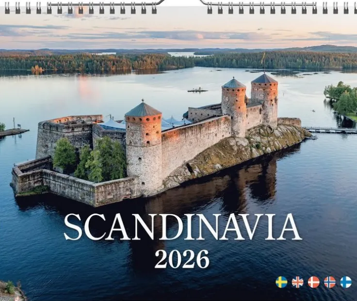 Väggkalender med tolv bilder från hela Skandinavien, den är femspråkig (svenska, engelska, danska, norska och finska).Väggkalender 2026 från Burde. Format: 300×240 mm. Layout: Månad/blad. Kalendarium: 2026-01-01 – 2026-12-31. Spiralbunden. Innehåll: Helgdagar, Internationella helgdagar. Antal sidor: 12. Miljöinformation: FSC®.
