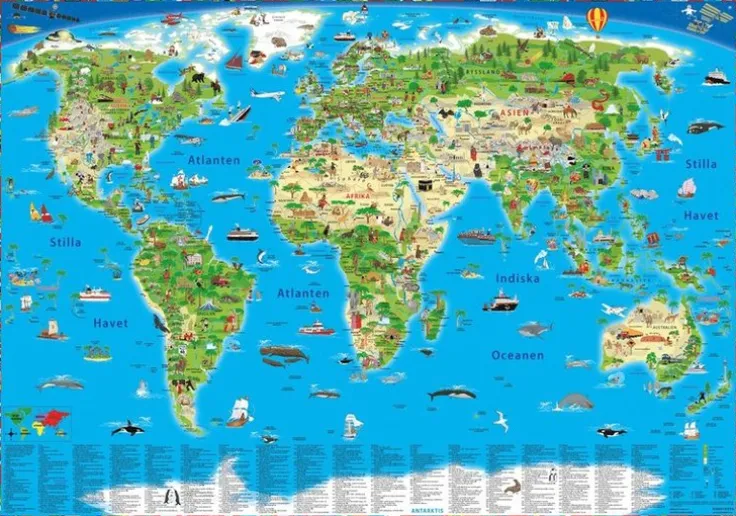 Illustrerad världskarta för både unga och gamla upptäcktsresande och globetrotters i alla åldrar.Denna internationella bästsäljare bland illustrerade världskartor finns nu även på svenska. Städer, floder, berg, hav, djur, historia, politik, underverk i världen och alla nationella flaggor finns med i den omfattande bildtexten.Kartan är lika informativ som den är underhållande och både barn och vuxna kommer att upptäcka häpnadsväckande ny information.