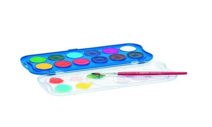 Färglåda Giotto Aquerelli med 12 färgkoppar Ø 30 mm och pensel. Vattenfärger av bra kvalitet, kan blandas så att du får både opaka färger och mer transparanta akvarellkulörer. Ej lämplig till barn under 3 år.